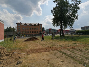 На территории сквера Увековечения Памяти Кимрских Новомучеников, напротив Преображенского собора г. Кимры, идет обустройство зоны волейбольной площадки. Данная территория предназначена для спортивных мероприятий воскресной школы, которая готовится к открытию летнего лагеря при храме.