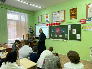 20 февраля 2026 года, в рамках соглашения о сотрудничестве, настоятель храма Иоанна Предтечи города Кимры протоиерей Владимир Кириллов встретился с учениками 5–9 классов филиала средней школы №5. Тема беседы — «Говори красиво — живи счастливо!» — была посвящена духовным и культурным аспектам сквернословия. Отец Владимир рассказал подросткам, как «гнилое слово» вредит не только детям, но и взрослым, разрушая личность и отношения между людьми. Школьники активно участвовали в диалоге: задавали вопросы, высказывали своё мнение об этой общественной проблеме и даже предлагали пути избавления от вредной привычки. Особый акцент был сделан на том, что словесная чистота способна вернуть радость жизни и сделать общение между людьми искренним и свежим. Для наглядности в ходе встречи были показаны видеоматериалы проекта «Россия без сквернословия». После завершения мероприятия протоиерей Владимир Кириллов вручил директору школы Светлане Юрьевне Королёвой информационные материалы проекта и тематические коллажи, созданные Отделом религиозного образования и катехизации Тверской епархии. Эти материалы предназначались для размещения в школьном холле, в специально отведённом православном уголке.
